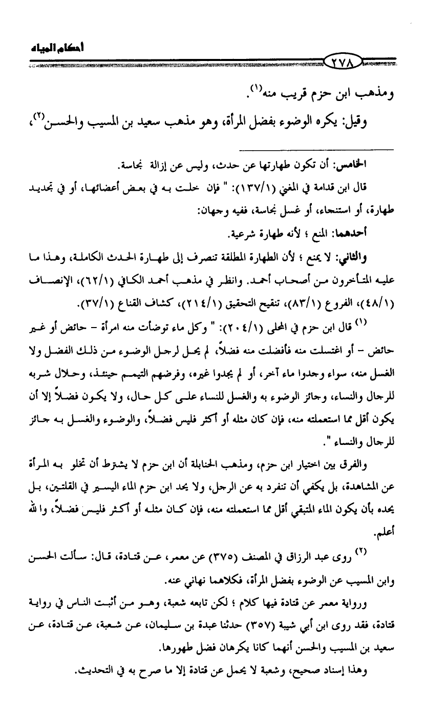 (¬١) قال ابن حزم في المحلى (١/ ٢٠٤): " وكل ماء توضأت منه امرأة - حائض أو غير حائض - أو اغتسلت منه فأفضلت منه فضلاً، لم يحل لرجل الوضوء من ذلك الفضل ولا الغسل منه، سواء وجدوا ماء آخر، أو لم يجدوا غيره، وفرضهم التيمم حينئذ، وحلال شربه للرجال والنساء، وجائز الوضوء به والغسل للنساء على كل حال، ولا يكون فضلاً إلا أن يكون أقل مما استعملته منه، فإن كان مثله أو أكثر فليس فضلاً، والوضوء والغسل به جائز للرجال والنساء ".