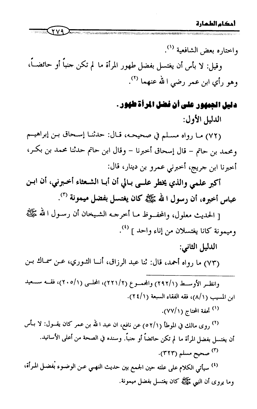(¬٢) روى مالك في الموطأ (١/ ٥٢) عن نافع، ان عبد الله بن عمر كان يقول: لا بأس أن يغتسل بفضل المرأة ما لم تكن حائضاً أو جنباً. وسنده في الصحة من أعلى الأسانيد.