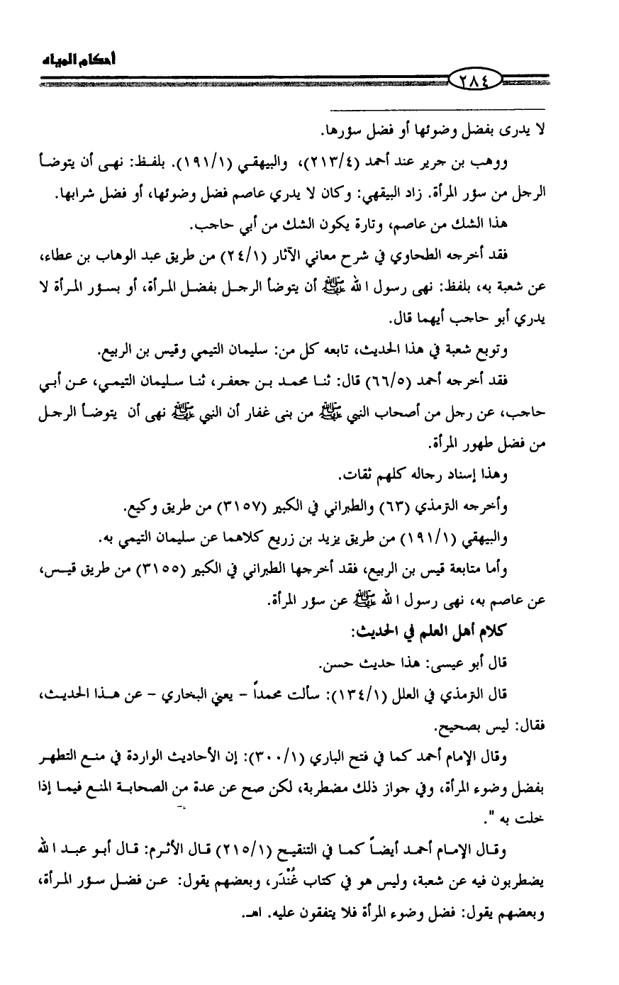 وقال الإمام أحمد كما في فتح الباري (١/ ٣٠٠): إن الأحاديث الواردة في منع التطهر بفضل وضوء المرأة، وفي جواز ذلك مضطربة، لكن صح عن عدة من الصحابة المنع فيما إذا خلت به ".