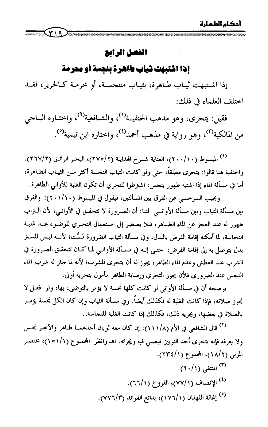(¬١) المبسوط (١٠/ ٢٠٠)، العناية شرح الهداية (٢/ ٢٧٥)، البحر الرائق (٢/ ٢٦٧). والحنفية هنا قالوا: يتحرى مطلقاً، حتى ولو كانت الثياب النجسة أكثر من الثياب الطاهرة، أما في مسألة الماء إذا اشتبه طهور بنجس، اشترطوا للتحري أن تكون الغلبة للأواني الطاهرة.