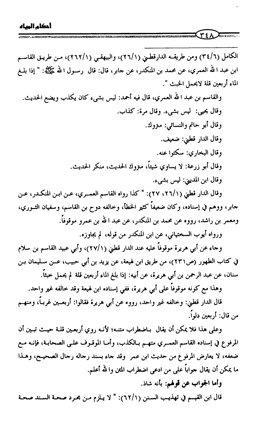= الكامل (٦/ ٣٤) ومن طريقه الدارقطني (١/ ٢٦)، والبيهقي (١/ ٢٦٢)، من طريق القاسم بن عبد الله العمري، عن محمد بن المنكدر، عن جابر، قال: قال رسول الله - صلى الله عليه وسلم -: " إذا بلغ الماء أربعين قلة لايحمل الخبث ".