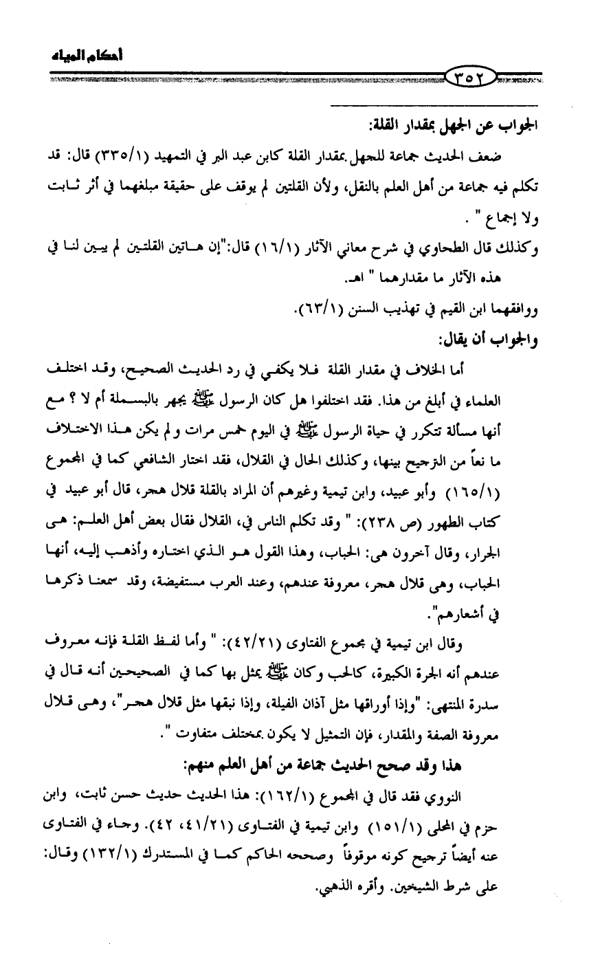 أما الخلاف في مقدار القلة فلا يكفي في رد الحديث الصحيح، وقد اختلف العلماء في أبلغ من هذا. فقد اختلفوا هل كان الرسول - صلى الله عليه وسلم - يجهر بالبسملة أم لا؟ مع أنها مسألة تتكرر في حياة الرسول - صلى الله عليه وسلم - في اليوم خمس مرات ولم يكن هذا الاختلاف ما نعاً من الترجيح بينها، وكذلك الحال في القلال، فقد اختار الشافعي كما في المجموع (١/ ١٦٥) وأبو عبيد، وابن تيمية وغيرهم أن المراد بالقلة قلال هجر، قال أبو عبيد في كتاب الطهور (ص ٢٣٨): " وقد تكلم الناس في، القلال فقال بعض أهل العلم: هى الجرار، وقال آخرون هى: الحباب، وهذا القول هو الذي اختاره وأذهب إليه، أنها الحباب، وهى قلال هجر، معروفة عندهم، وعند العرب مستفيضة، وقد سمعنا ذكرها في أشعارهم".