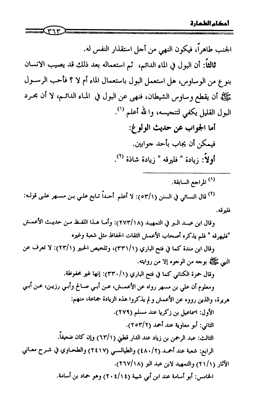 (¬٢) قال النسائي في السنن (١/ ٥٣): لا أعلم أحداً تابع علي بن مسهر على قوله: فليرقه.