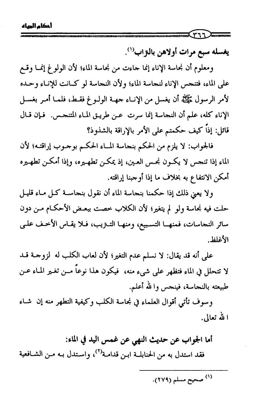 ولا يعني ذلك إذا حكمنا بنجاسة الماء أن نقول بنجاسة كل ماء قليل حلت فيه نجاسة ولو لم يتغير؛ لأن الكلاب خصت ببعض الأحكام من دون سائر النجاسات، فمنها التسبيع، ومنها التتريب، فلا يقاس الأخف على الأغلظ.