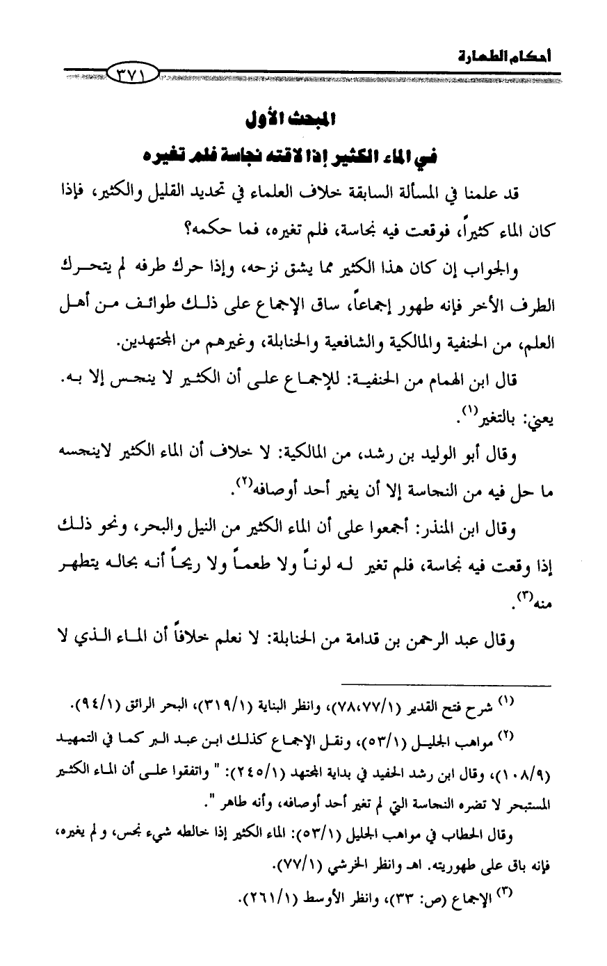 (¬٢) مواهب الجليل (١/ ٥٣)، ونقل الإجماع كذلك ابن عبد البر كما في التمهيد (٩/ ١٠٨)، وقال ابن رشد الحفيد في بداية المجتهد (١/ ٢٤٥): " واتفقوا على أن الماء الكثير المستبحر لا تضره النجاسة التي لم تغير أحد أوصافه، وأنه طاهر ".