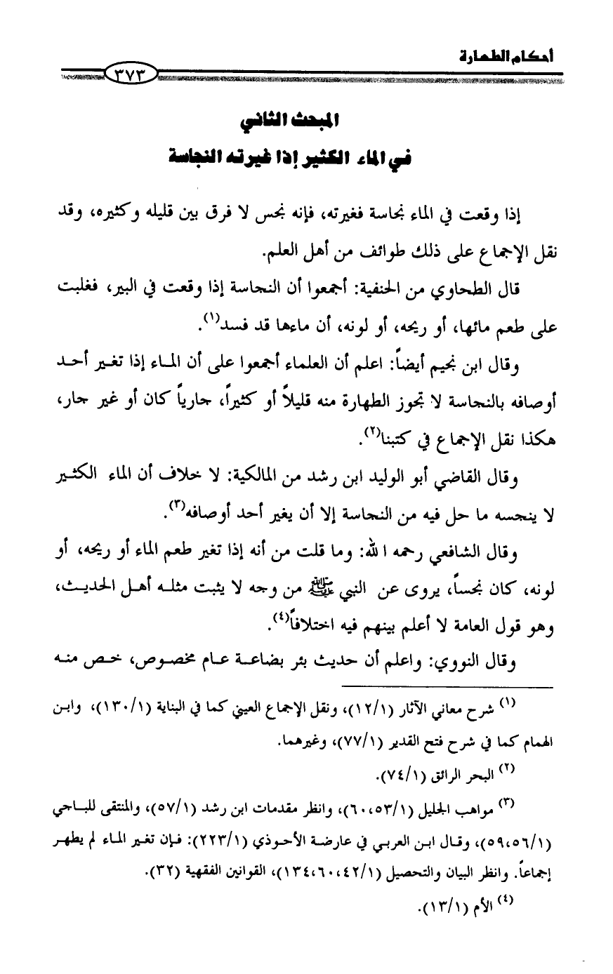 (¬٣) مواهب الجليل (١/ ٥٣،٦٠)، وانظر مقدمات ابن رشد (١/ ٥٧)، والمنتقى للباجي (١/ ٥٦،٥٩)، وقال ابن العربي في عارضة الأحوذي (١/ ٢٢٣): فإن تغير الماء لم يطهر إجماعاً. وانظر البيان والتحصيل (١/ ٤٢،٦٠،١٣٤)، القوانين الفقهية (٣٢).
