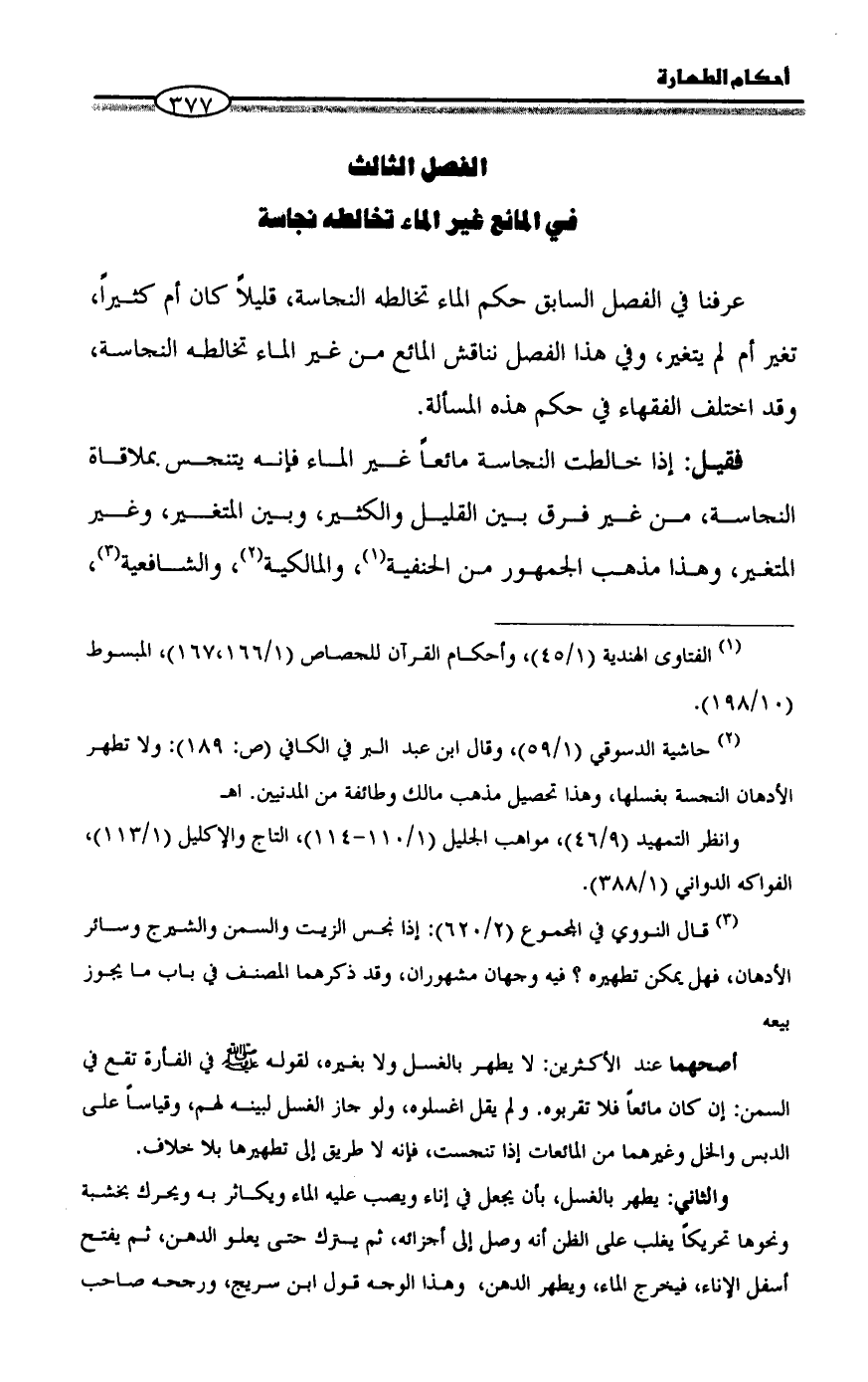 (¬٣) قال النووي في المجموع (٢/ ٦٢٠): إذا نجس الزيت والسمن والشيرج وسائر الأدهان، فهل يمكن تطهيره؟ فيه وجهان مشهوران، وقد ذكرهما المصنف في باب ما يجوز بيعه