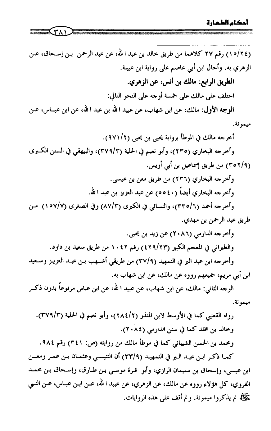 الوجه الأول: مالك، عن ابن شهاب، عن عبيد الله بن عبد الله، عن ابن عباس، عن ميمونة.