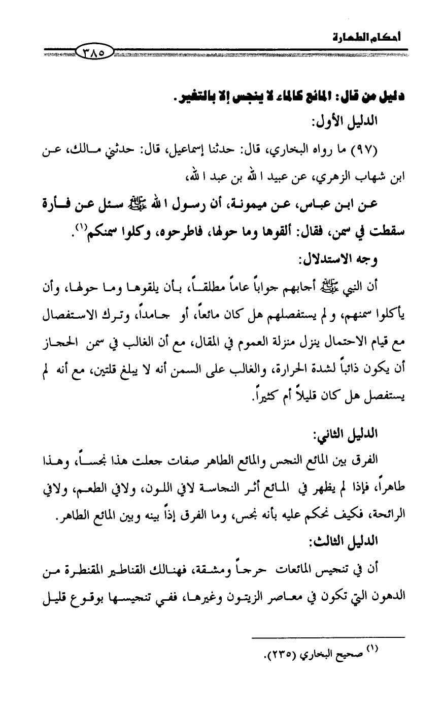 أن النبي - صلى الله عليه وسلم - أجابهم جواباً عاماً مطلقاً، بأن يلقوها وما حولها، وأن يأكلوا سمنهم، ولم يستفصلهم هل كان مائعاً، أو جامداً، وترك الاستفصال مع قيام الاحتمال ينزل منزلة العموم في المقال، مع أن الغالب في سمن الحجاز أن يكون ذائباً لشدة الحرارة، والغالب على السمن أنه لا يبلغ قلتين، مع أنه لم يستفصل هل كان قليلاً أم كثيراً.