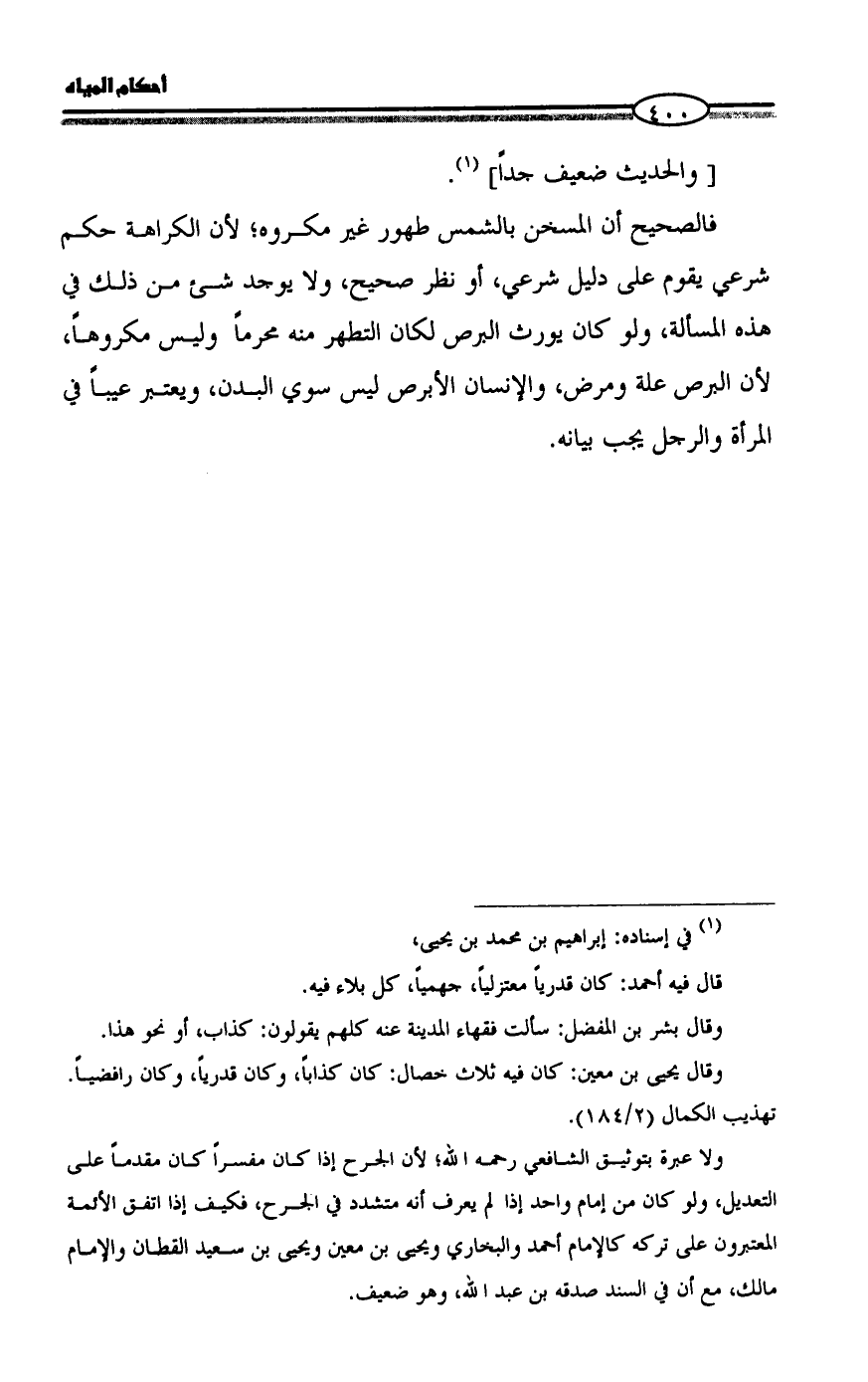 فالصحيح أن المسخن بالشمس طهور غير مكروه؛ لأن الكراهة حكم شرعي يقوم على دليل شرعي، أو نظر صحيح، ولا يوجد شئ من ذلك في هذه المسألة، ولو كان يورث البرص لكان التطهر منه محرماً وليس مكروهاً، لأن البرص علة ومرض، والإنسان الأبرص ليس سوي البدن، ويعتبر عيباً في المرأة والرجل يجب بيانه.