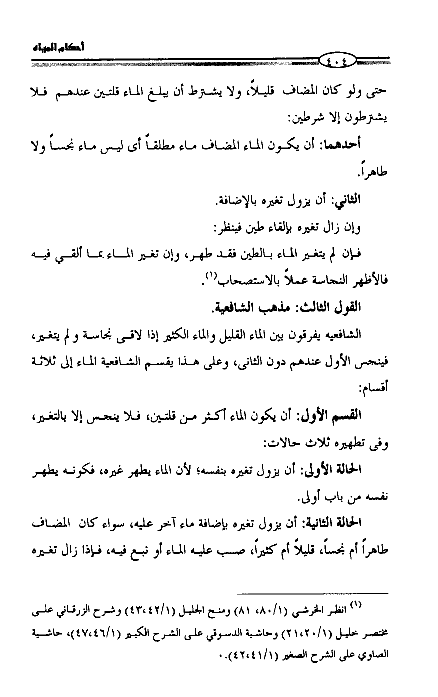 (¬١) انظر الخرشي (١/ ٨٠، ٨١) ومنح الجليل (١/ ٤٢، ٤٣) وشرح الزرقاني على مختصر خليل (١/ ٢٠، ٢١) وحاشية الدسوقي على الشرح الكبير (١/ ٤٦،٤٧)، حاشية الصاوي على الشرح الصغير (١/ ٤١، ٤٢).