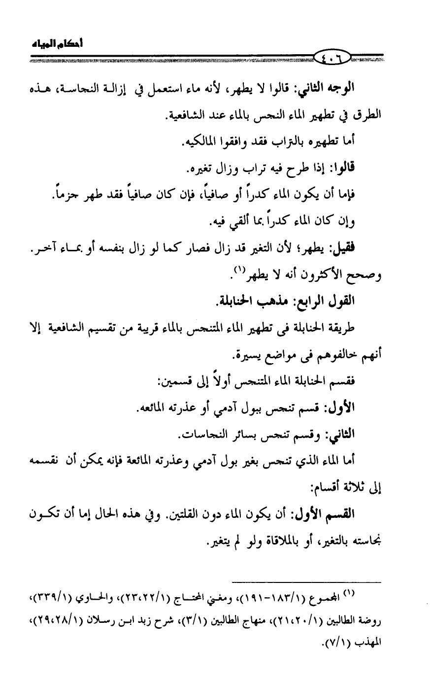 طريقة الحنابلة فى تطهير الماء المتنجس بالماء قريبة من تقسيم الشافعية إلا أنهم خالفوهم فى مواضع يسيرة.