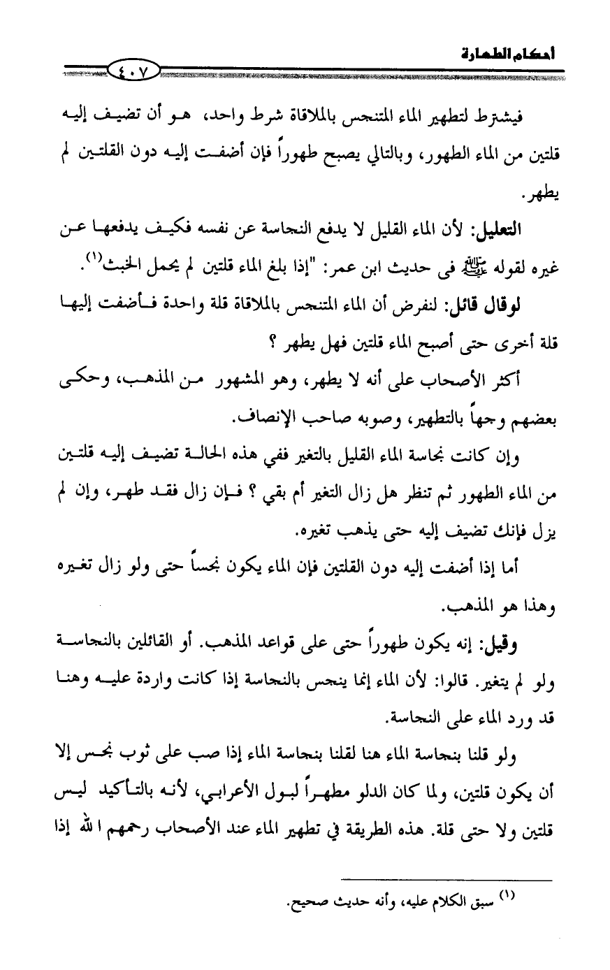 ولو قلنا بنجاسة الماء هنا لقلنا بنجاسة الماء إذا صب على ثوب نجس إلا أن يكون قلتين، ولما كان الدلو مطهراً لبول الأعرابي، لأنه بالتأكيد ليس قلتين ولا حتى قلة. هذه الطريقة في تطهير الماء عند الأصحاب رحمهم الله إذا