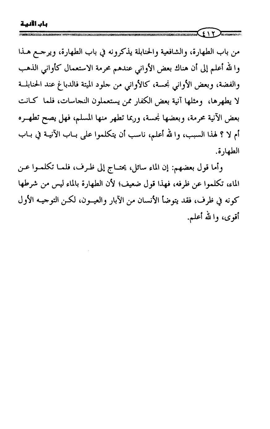 من باب الطهارة، والشافعية والحنابلة يذكرونه في باب الطهارة، ويرجع هذا والله أعلم إلى أن هناك بعض الأواني عندهم محرمة الاستعمال كأواني الذهب والفضة، وبعض الأواني نجسة، كالأواني من جلود الميتة فالدباغ عند الحنابلة لا يطهرها، ومثلها آنية بعض الكفار ممن يستعملون النجاسات، فلما كانت بعض الآنية محرمة، وبعضها نجسة، وربما تطهر منها المسلم، فهل يصح تطهره أم لا؟ لهذا السبب، والله أعلم، ناسب أن يتكلموا على باب الآنية في باب الطهارة.