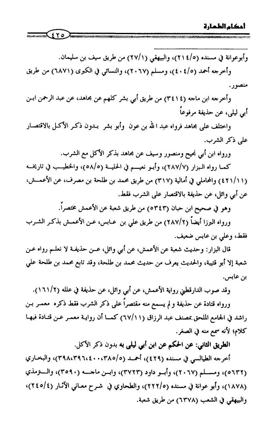 كما رواه البزار (٧/ ٢٨٧)، وأبو نعيم في الحلية (٥/ ٥٨)، والخطيب في تاريخه (١١/ ٤٢١) والمحاملي في أمالية (٣١٧) من طريق محمد بن طلحة بن مصرف، عن الأعمش، عن أبي وائل، عن حذيفة بالاقتصار على الشرب فقط.