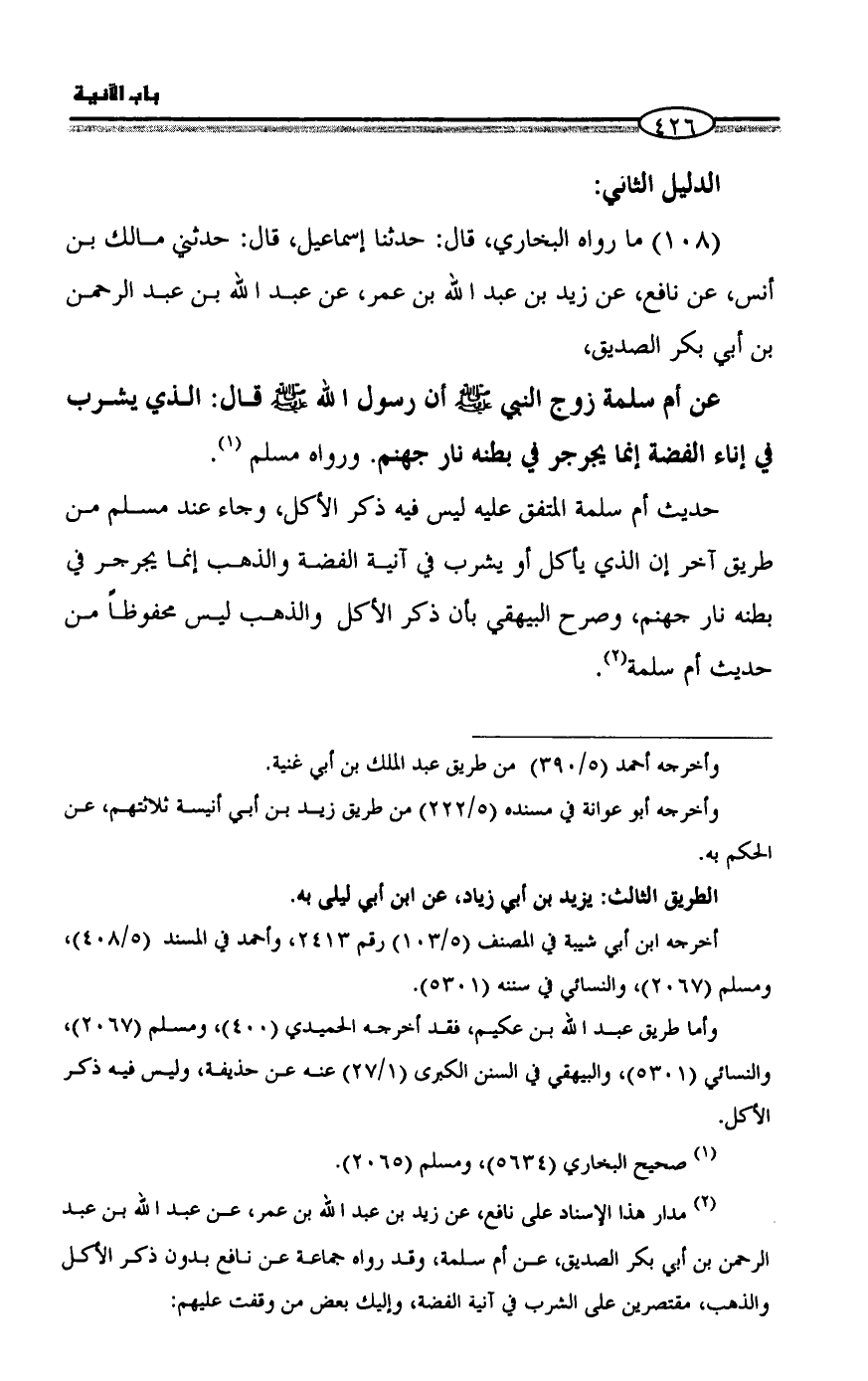 (¬٢) مدار هذا الإسناد على نافع، عن زيد بن عبد الله بن عمر، عن عبد الله بن عبد الرحمن بن أبي بكر الصديق، عن أم سلمة، وقد رواه جماعة عن نافع بدون ذكر الأكل والذهب، مقتصرين على الشرب في آنية الفضة، وإليك بعض من وقفت عليهم: =