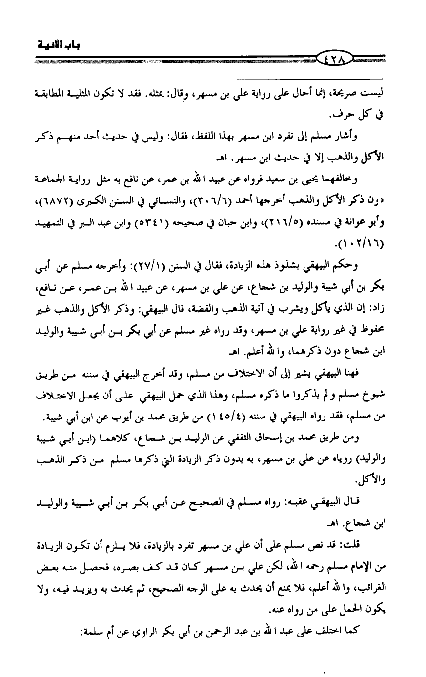 وحكم البيهقي بشذوذ هذه الزيادة، فقال في السنن (١/ ٢٧): وأخرجه مسلم عن أبي بكر بن أبي شيبة والوليد بن شجاع، عن علي بن مسهر، عن عبيد الله بن عمر، عن نافع، زاد: إن الذي يأكل ويشرب في آنية الذهب والفضة، قال البيهقي: وذكر الأكل والذهب غير محفوظ في غير رواية علي بن مسهر، وقد رواه غير مسلم عن أبي بكر بن أبي شيبة والوليد بن شجاع دون ذكرهما، والله أعلم. اهـ