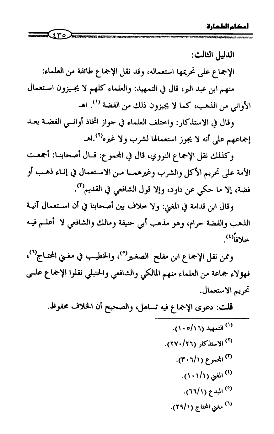 وممن نقل الإجماع ابن مفلح الصغير (¬٥)، والخطيب في مغني المحتاج (¬٦)، فهؤلاء جماعة من العلماء منهم المالكي والشافعي والحنبلي نقلوا الإجماع على تحريم الاستعمال.
