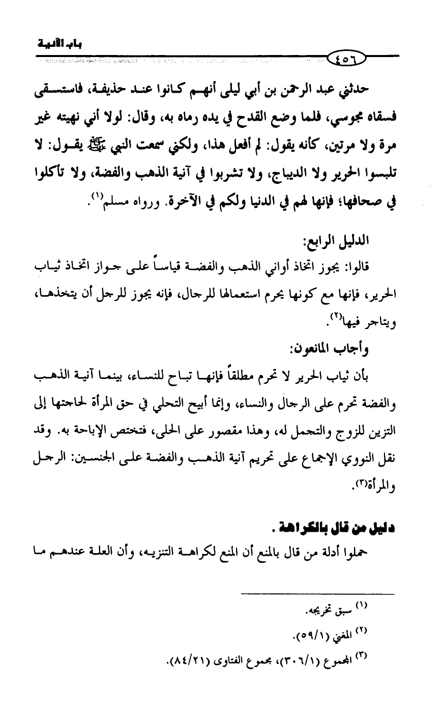 بأن ثياب الحرير لا تحرم مطلقاً فإنها تباح للنساء، بينما آنية الذهب والفضة تحرم على الرجال والنساء، وإنما أبيح التحلي في حق المرأة لحاجتها إلى التزين للزوج والتجمل له، وهذا مقصور على الحلى، فتختص الإباحة به. وقد نقل النووي الإجماع على تحريم آنية الذهب والفضة على الجنسين: الرجل والمرأة (¬٣).