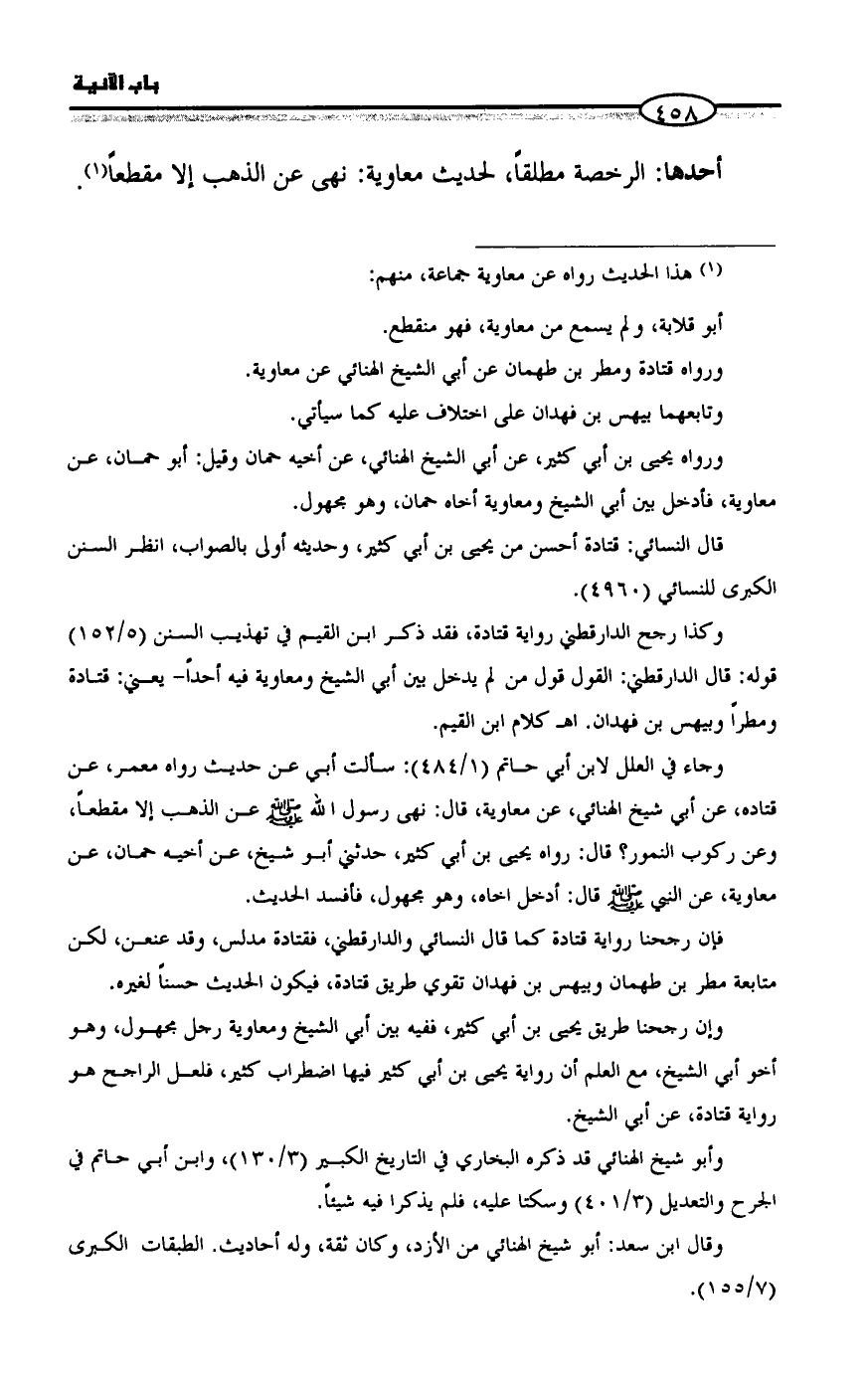 وجاء في العلل لابن أبي حاتم (١/ ٤٨٤): سألت أبي عن حديث رواه معمر، عن قتاده، عن أبي شيخ الهنائي، عن معاوية، قال: نهى رسول الله - صلى الله عليه وسلم - عن الذهب إلا مقطعاً، وعن ركوب النمور؟ قال: رواه يحيى بن أبي كثير، حدثني أبو شيخ، عن أخيه حمان، عن معاوية، عن النبي - صلى الله عليه وسلم - قال: أدخل اخاه، وهو مجهول، فأفسد الحديث.