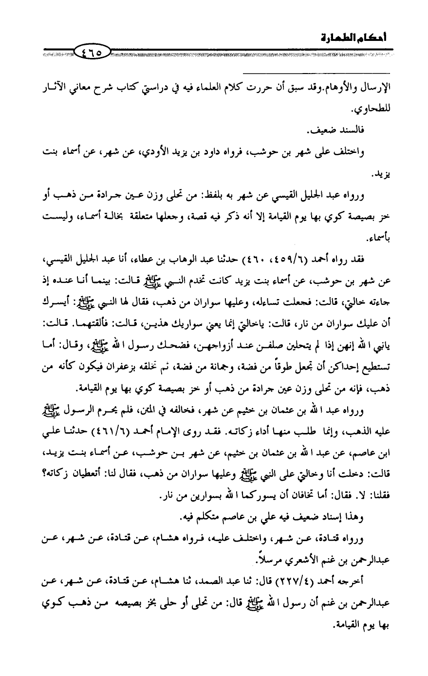 فقد رواه أحمد (٦/ ٤٥٩، ٤٦٠) حدثنا عبد الوهاب بن عطاء، أنا عبد الجليل القيسي، عن شهر بن حوشب، عن أسماء بنت يزيد كانت تخدم النبي - صلى الله عليه وسلم - قالت: بينما أنا عنده إذ جاءته خالتي، قالت: فجعلت تساءله، وعليها سواران من ذهب، فقال لها النبي - صلى الله عليه وسلم -: أيسرك أن عليك سواران من نار، قالت: ياخالتي إنما يعني سواريك هذين، قالت: فألقتهما. قالت: يانبي الله إنهن إذا لم يتحلين صلفن عند أزواجهن، فضحك رسول الله - صلى الله عليه وسلم -، وقال: أما تستطيع إحداكن أن تجعل طوقاً من فضة، وجمانة من فضة، ثم تخلقه بزعفران فيكون كأنه من ذهب، فإنه من تحلى وزن عين جرادة من ذهب أو خز بصيصة كوي بها يوم القيامة.