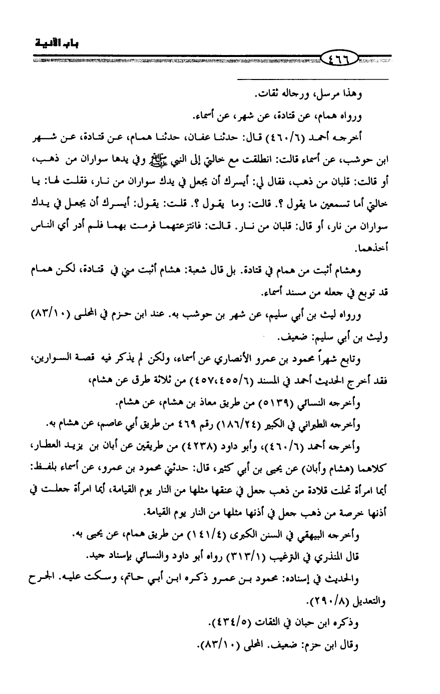 أخرجه أحمد (٦/ ٤٦٠) قال: حدثنا عفان، حدثنا همام، عن قتادة، عن شهر بن حوشب، عن أسماء قالت: انطلقت مع خالتي إلى النبي ص وفي يدها سواران من ذهب، أو قالت: قلبان من ذهب، فقال لي: أيسرك أن يجعل في يدك سواران من نار، فقلت لها: يا خالتي أما تسمعين ما يقول؟. قالت: وما يقول؟. قلت: يقول: أيسرك أن يجعل في يدك سواران من نار، أو قال: قلبان من نار. قالت: فانتزعتهما فرمت بهما فلم أدر أي الناس أخذهما.