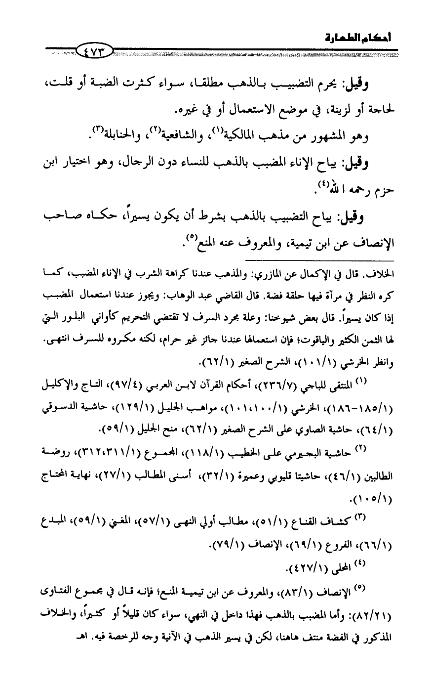 (¬٥) الإنصاف (١/ ٨٣)، والمعروف عن ابن تيمية المنع؛ فإنه قال في مجموع الفتاوى (٢١/ ٨٢): وأما المضبب بالذهب فهذا داخل في النهي، سواء كان قليلاً أو كثيراً، والخلاف المذكور في الفضة منتف هاهنا، لكن في يسير الذهب في الآنية وجه للرخصة فيه. اهـ