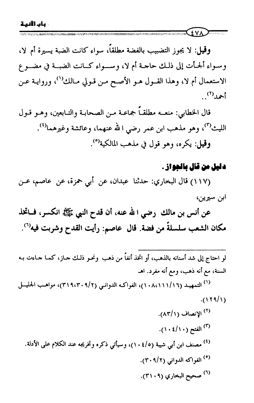 وقيل: لا يجوز التضبيب بالفضة مطلقاً، سواء كانت الضبة يسيرة أم لا، وسواء ألجأت إلى ذلك حاجة أم لا، وسواء كانت الضبة في مضوع الاستعمال أم لا، وهذا القول هو الأصح من قولي مالك (¬١)، ورواية عن أحمد (¬٢) ..