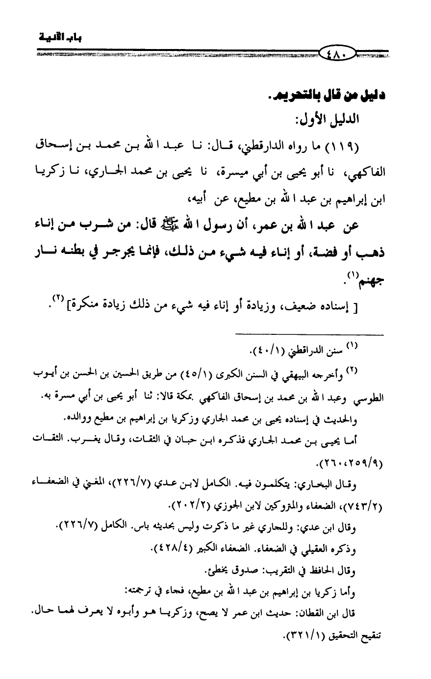 (١١٩) ما رواه الدارقطني، قال: نا عبد الله بن محمد بن إسحاق الفاكهي، نا أبو يحيى بن أبي ميسرة، نا يحيى بن محمد الجاري، نا زكريا بن إبراهيم بن عبد الله بن مطيع، عن أبيه،
