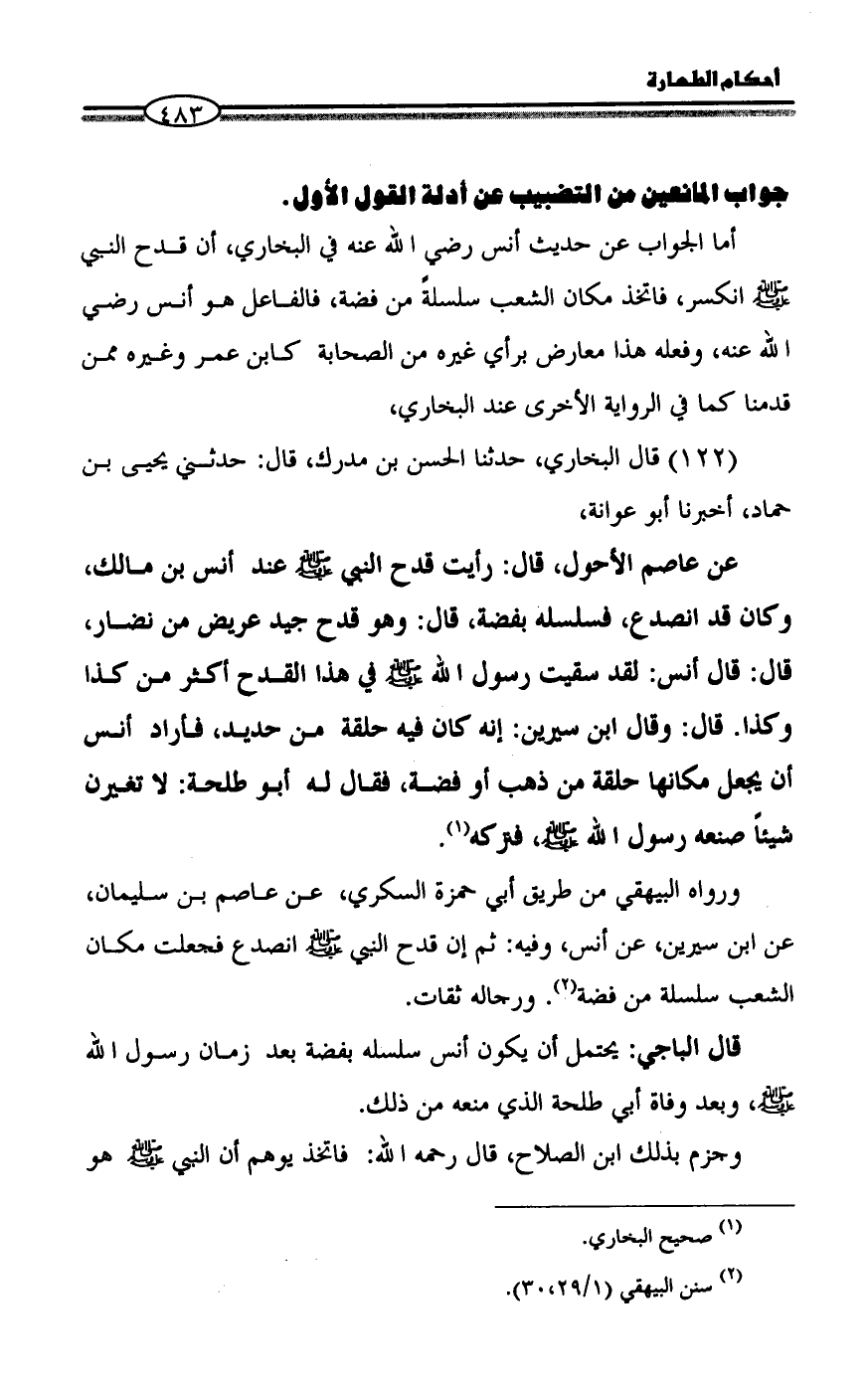 أما الجواب عن حديث أنس رضي الله عنه في البخاري، أن قدح النبي - صلى الله عليه وسلم - انكسر، فاتخذ مكان الشعب سلسلةً من فضة، فالفاعل هو أنس رضي الله عنه، وفعله هذا معارض برأي غيره من الصحابة كابن عمر وغيره ممن قدمنا كما في الرواية الأخرى عند البخاري،