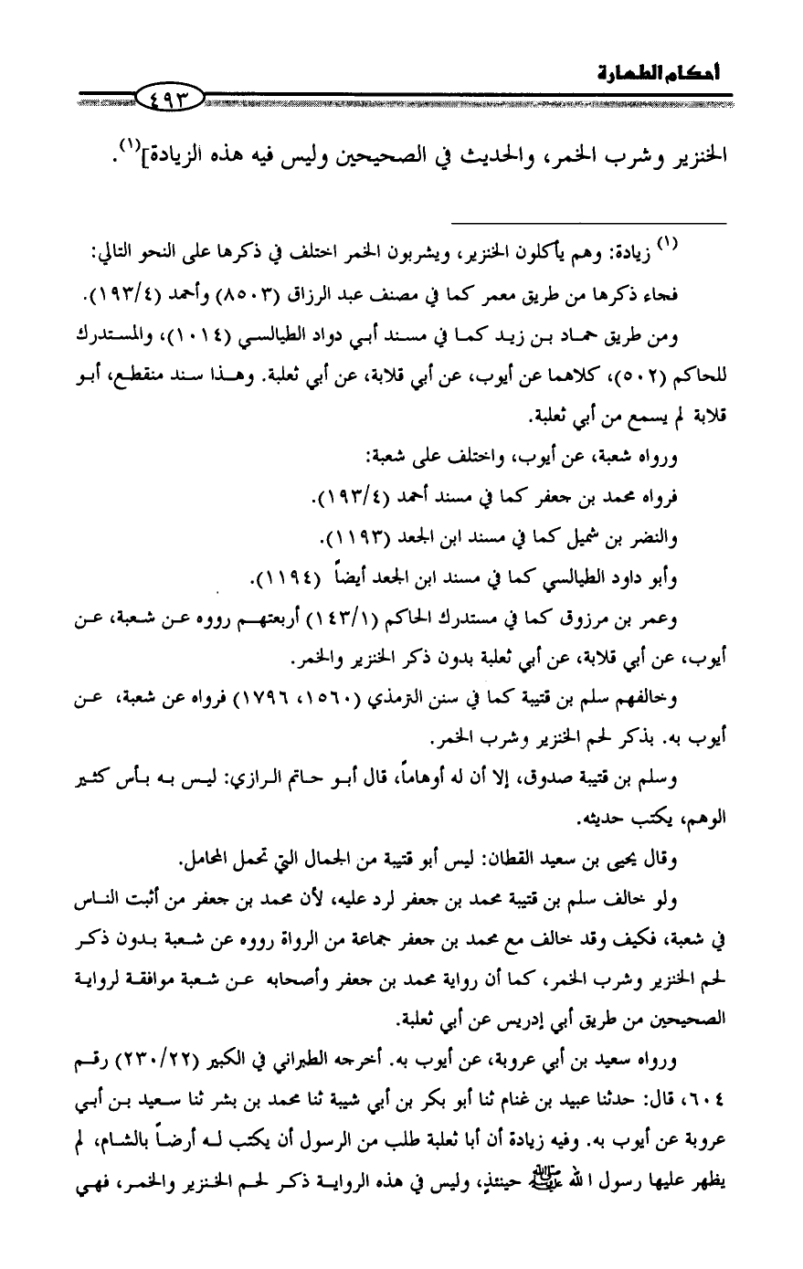 وعمر بن مرزوق كما في مستدرك الحاكم (١/ ١٤٣) أربعتهم رووه عن شعبة، عن أيوب، عن أبي قلابة، عن أبي ثعلبة بدون ذكر الخنزير والخمر.