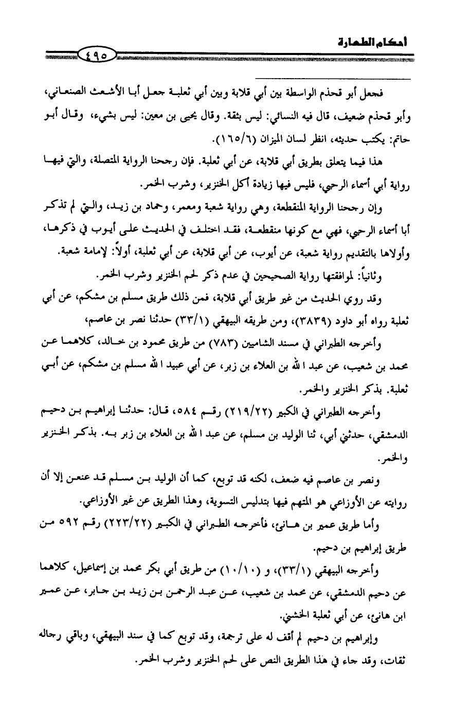 هذا فيما يتعلق بطريق أبي قلابة، عن أبي ثعلبة. فإن رجحنا الرواية المتصلة، والتي فيها رواية أبي أسماء الرحبي، فليس فيها زيادة أكل الخنزير، وشرب الخمر.