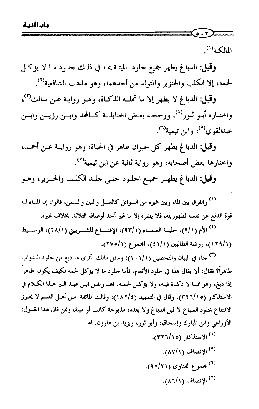 (¬٣) جاء في البيان والتحصيل (١/ ١٠١): وسئل مالك: أترى ما دبغ من جلود الدواب طاهراً؟ فقال: ألا يقال هذا في جلود الأنعام، فأما جلود ما لا يؤكل لحمه فكيف يكون طاهراً إذا دبغ، وهو مما لا ذكاة فيه، ولا يؤكل لحمه. اهـ ونقل ابن عبد البر هذا الكلام في الاستذكار (١٥/ ٣٢٦). وقال في التمهيد (٤/ ١٨٢): وقالت طائفة من أهل العلم لا يجوز الانتفاع بجلود السباع لا قبل الدباغ ولا بعده، مذبوحة كانت أو ميتة، وممن قال هذا القول: الأوزاعي وابن المبارك وإسحاق، وأبو ثور، ويزيد بن هارون. اهـ