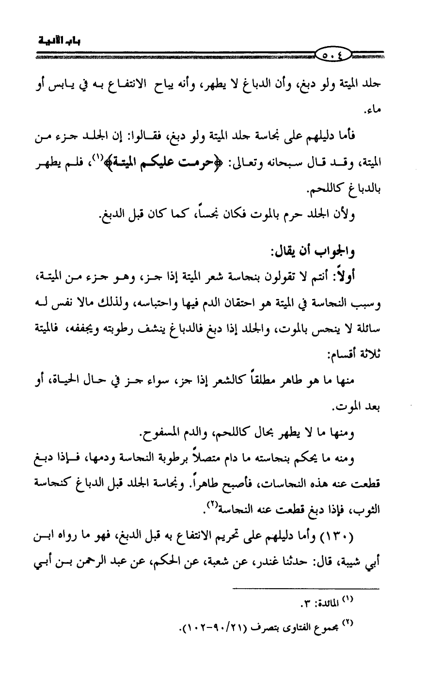 جلد الميتة ولو دبغ، وأن الدباغ لا يطهر، وأنه يباح الانتفاع به في يابس أو ماء.