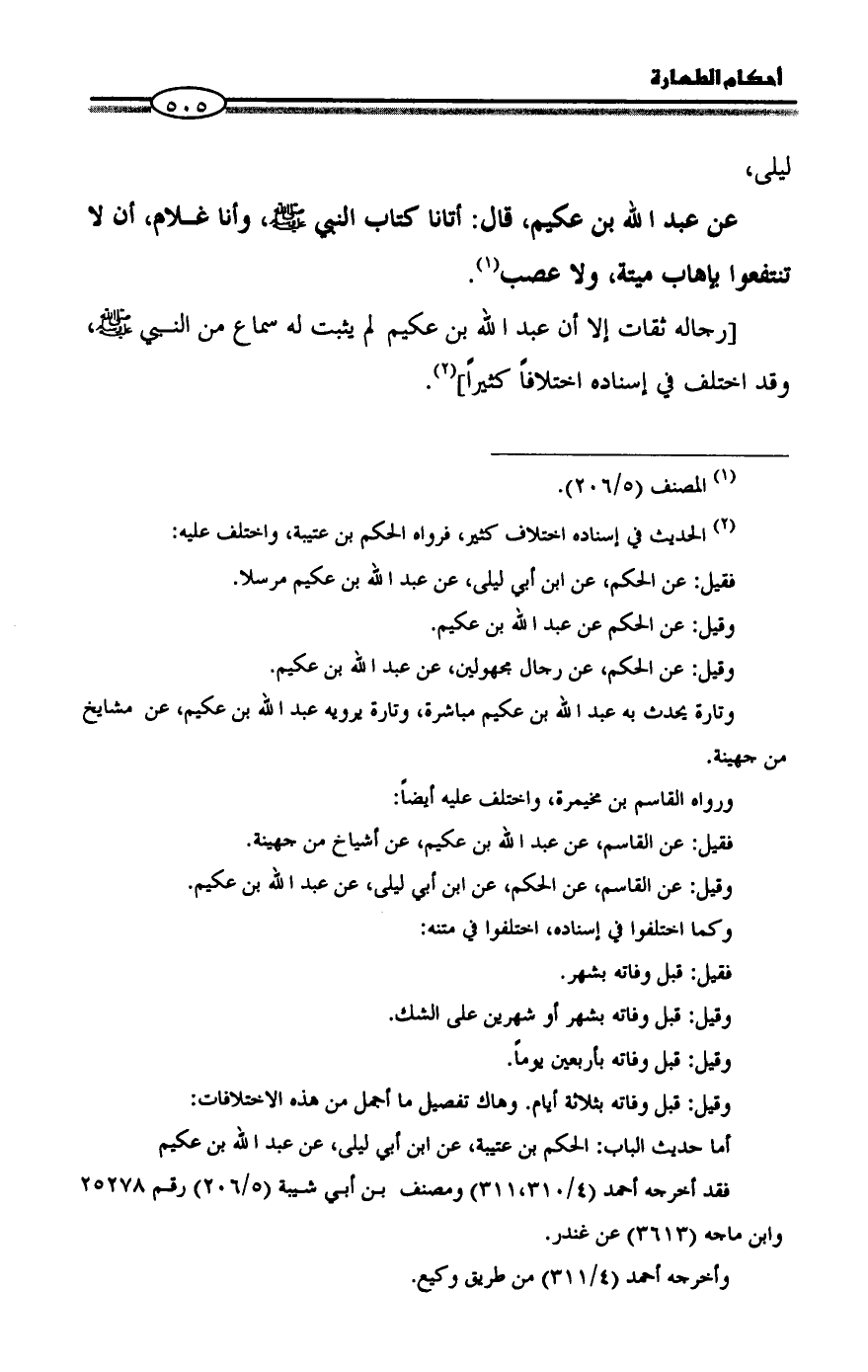 عن عبد الله بن عكيم، قال: أتانا كتاب النبي - صلى الله عليه وسلم -، وأنا غلام، أن لا تنتفعوا بإهاب ميتة، ولا عصب (¬١).