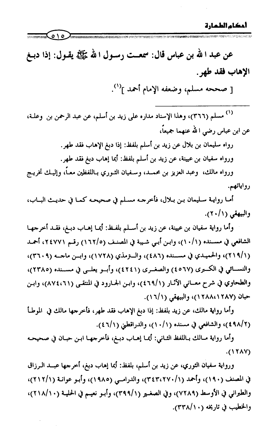 ورواية سفيان الثوري، عن زيد بن أسلم، بلفظ: أيما إهاب دبغ، أخرجها عبد الرزاق في المصنف (١٩٠)، وأحمد (١/ ٢٧٠،٣٤٣)، والدرامي (١٩٨٥)، وأبو عوانة (١/ ٢١٢)، والطبراني في الأوسط (٧٢٨٩)، وفي الصغير (١/ ٣٩٩)، وأبو نعيم في الحلية (١٠/ ٢١٨)، والخطيب في تاريخه (١٠/ ٣٣٨). =