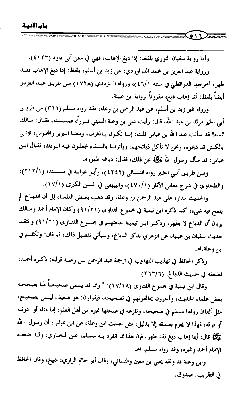 وذكر الحافظ في تهذيب التهذيب في ترجمة عبد الرحمن بن وعلة قوله: ذكره أحمد، فضعفه في حديث الدباغ. (٦/ ٢٦٣).