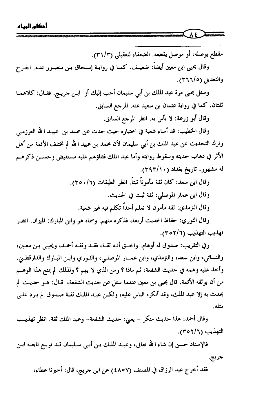 وفي التقريب: صدوق له أوهام. والحق أنه ثقة، فقد وثقه أحمد، ويحيى بن معين، والنسائي، وابن سعد، والترمذي، وابن عمار الموصلي، والثوري وابن المبارك والدارقطني. وأخذ عليه وهمه في حديث الشفعة، ثم ماذا؟ ومن الذي لا يهم؟ ولذلك لم يمنع هذا الوهم من أن يوثقه الأئمة. قال يحيى بن معين عندما سئل عن حديث الشفعة، قال: هو حديث لم يحدث به إلا عبد الملك، وقد أنكره الناس عليه، ولكن عبد الملك ثقة صدوق لم يرد على مثله.