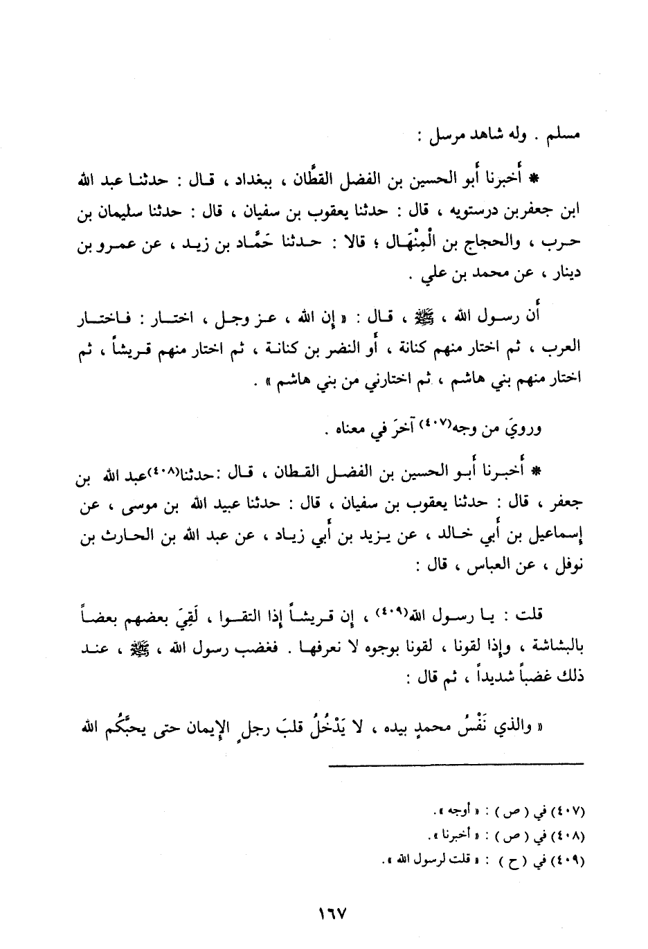 أَنَّ رَسُولَ اللهِ، صَلَّى اللهُ عَلَيْهِ وَسَلَّمَ، قَالَ: «إِنَّ اللهَ، عَزَّ وَجَلَّ، اخْتَارَ: فَاخْتَارَ الْعَرَبَ، ثُمَّ اخْتَارَ مِنْهُمْ كِنَانَةَ، أَوِ النَّضْرِ بْنَ كِنَانَةَ، ثُمَّ اخْتَارَ مِنْهُمْ قُرَيْشًا، ثُمَّ اخْتَارَ مِنْهُمْ بَنِي هَاشِمٍ، ثُمَّ اخْتَارَنِي مِنْ بَنِي هَاشِمٍ» .