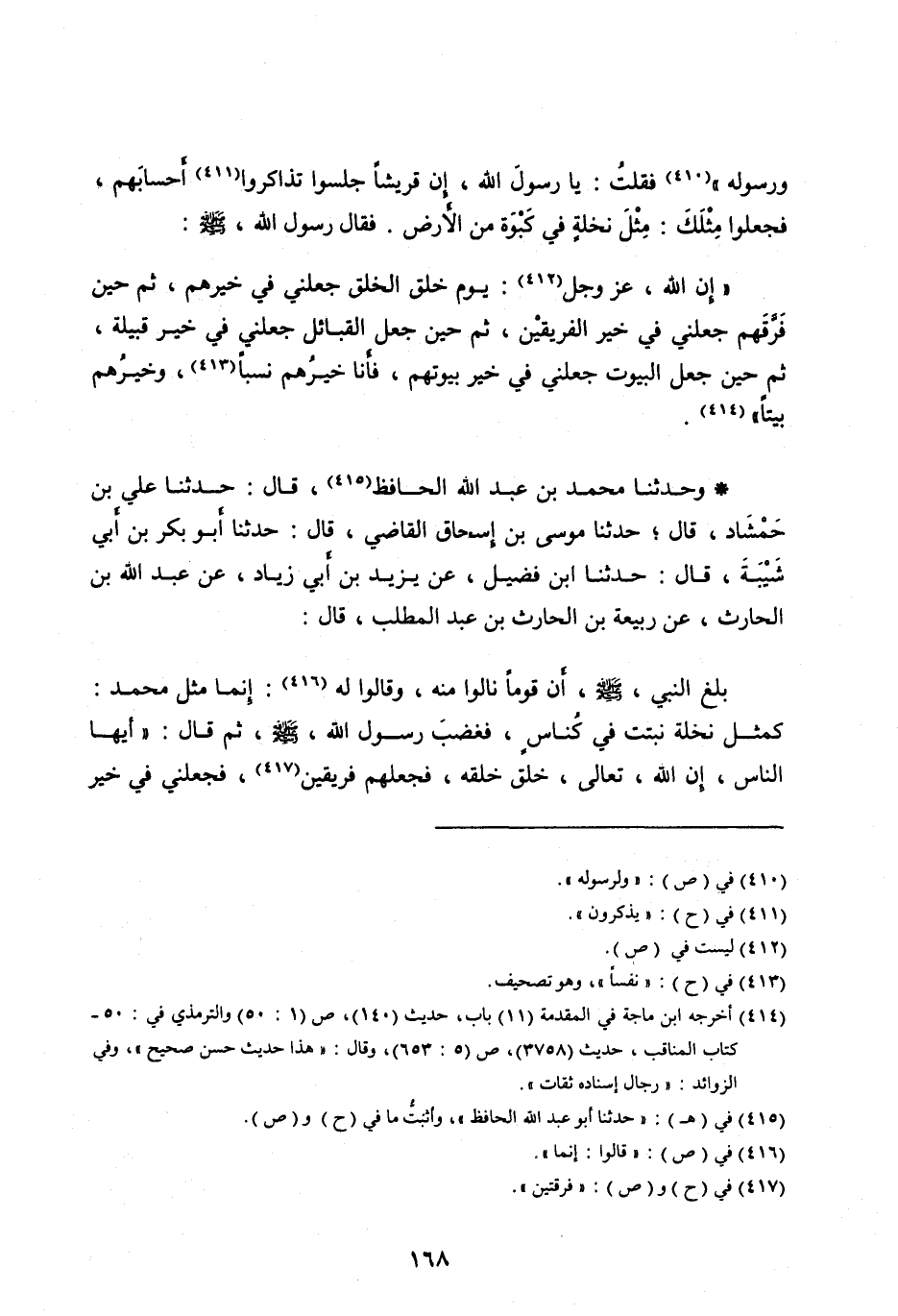 [ (414) ] أخرجه ابن ماجة في المقدمة (11) باب، حديث (140) ، ص (1: 50) والترمذي في: 50- كتاب المناقب، حديث (3758) ، ص (5: 653) ، وقال: «هذا حديث حسن صحيح» ، وفي الزوائد: «رجال إسناده ثقات» .
