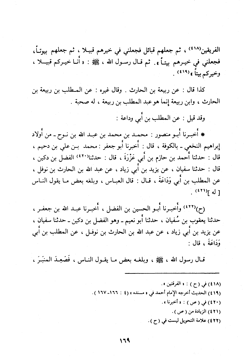 (ح) [ (422) ] وأَخْبَرَنَا أَبُو الْحُسَيْنِ بْنُ الْفَضْلِ، أَخْبَرَنَا عَبْدُ اللهِ بْنُ جَعْفَرٍ، حَدَّثَنَا يَعْقُوبُ بْنُ سُفْيَانَ، حَدَّثَنَا أَبُو نُعَيْمٍ- وَهُوَ الْفَضْلُ بْنُ دُكَيْنٍ- حَدَّثَنَا سُفْيَانُ، عَنْ يَزِيدَ بْنِ أَبِي زِيَادٍ، عَنْ عَبْدِ اللهِ بْنِ الْحَارِثِ بْنِ نَوْفَلٍ، عَنِ الْمُطَّلِبِ بْنِ أَبِي وَدَاعَةَ، قَالَ: قَالَ رَسُولُ اللهِ، صَلَّى اللهُ عَلَيْهِ وَسَلَّمَ، وَبَلَغَهُ بَعْضُ مَا يَقُولُ النَّاسُ، فصعد المنبر،
