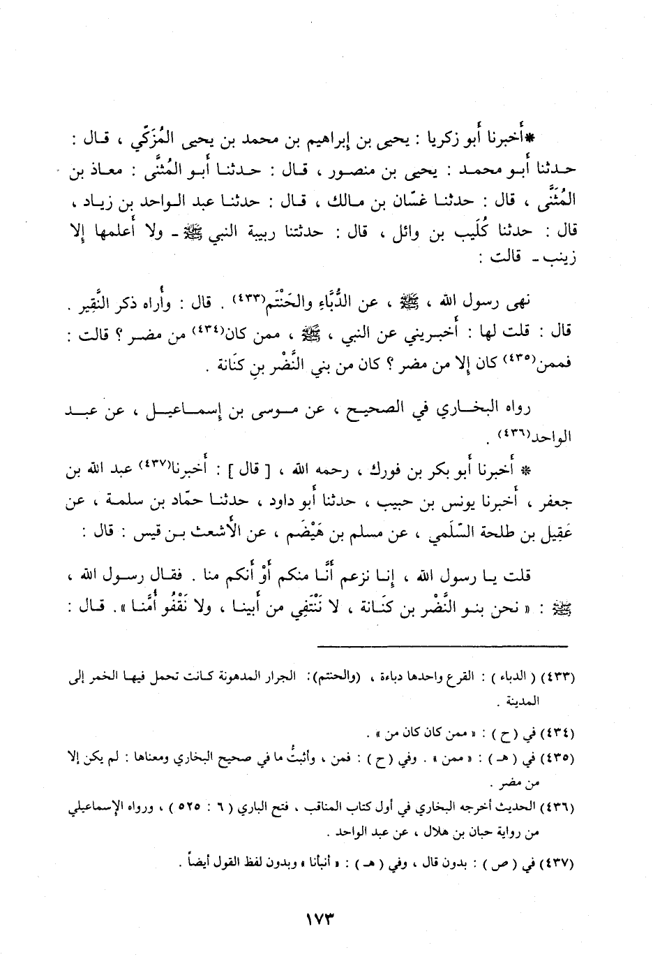 نَهَى رَسُولُ اللهِ، صلى الله عليه وَسَلَّمَ، عَنِ الدُّبَّاءِ وَالْحَنْتَمِ [ (433) ] . قَالَ: وَأُرَاهُ ذَكَرَ النَّقِيرَ.