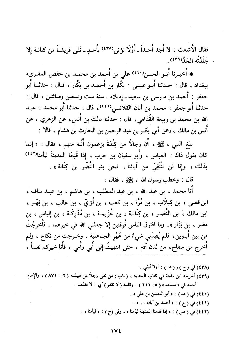 فَقَالَ الْأَشْعَثُ: لَا أَجِدُ أحدا- أولا نُؤْتَى [ (438) ] بِأَحَدٍ- نَفَى قُرَيْشًا مِنْ كِنَانَةَ إِلَّا جَلَدْتُهُ الْحَدَّ [ (439) ] .