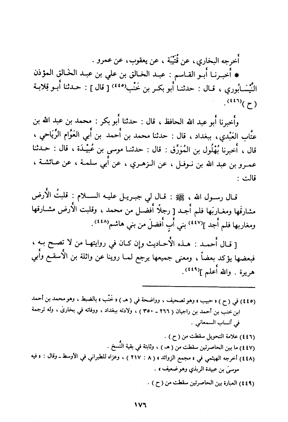 قَالَ رَسُولُ اللهِ، صَلَّى اللهُ عَلَيْهِ وَسَلَّمَ: قَالَ لِي جِبْرِيلُ عَلَيْهِ السَّلَامُ: قَلَبْتُ الْأَرْضَ مَشَارِقَهَا وَمَغَارِبَهَا فَلَمْ أَجِدْ [رَجُلًا أَفْضَلَ مِنْ مُحَمَّدٍ، وَقَلَبْتُ الْأَرْضَ مَشَارِقَهَا وَمَغَارِبَهَا فَلَمْ أَجِدْ] [ (447) ] بَنِي أَبٍ أَفْضَلَ مِنْ بَنِي هَاشِمٍ [ (448) ] .