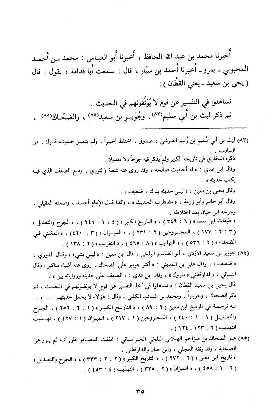 [ (84) ] جويبر بن سعيد الأزدي، أبو القاسم البلخي: قال ابن معين: «ليس بشيء» وقال الدوري: