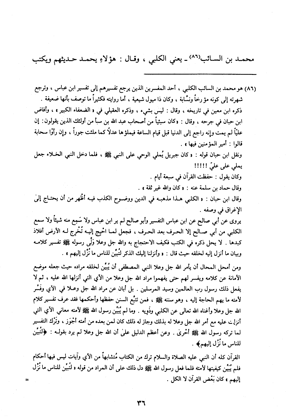 [ (86) ] هو مُحَمَّدِ بْنِ السَّائِبِ الْكَلْبِيُّ، أحد المفسرين الذين يرجع تفسيرهم إلى تفسير ابن عباس، وترجع شهرته إلى كونه مؤرخا ونسّابة، وكان ذا ميول شيعية، أما روايته فكثيرا ما توصف بأنها ضعيفة.