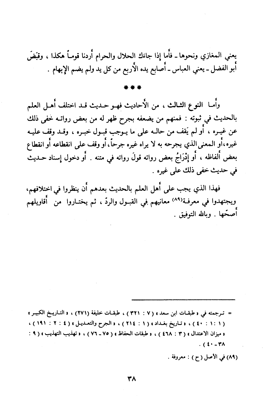 وأما النوع الثالث، من الأحاديث فهو حديث قد اختلف أهل العلم بالحديث في ثبوته: فمنهم من يضعفه بجرح ظهر له من بعض رواته خفى ذلك عن غيره، أو لم يقف من حاله على ما يوجب قبول خبره، وقد وقف عليه غيره، أو المعنى الذي يجرحه به لا يراه غيره جرحا، أو وقف على انقطاعه أو انقطاع بعض ألفاظه، أو إدراج بعض رواته قول رواته في متنه. أو دخول إسناد حديث في حديث خفى ذلك على غيره.