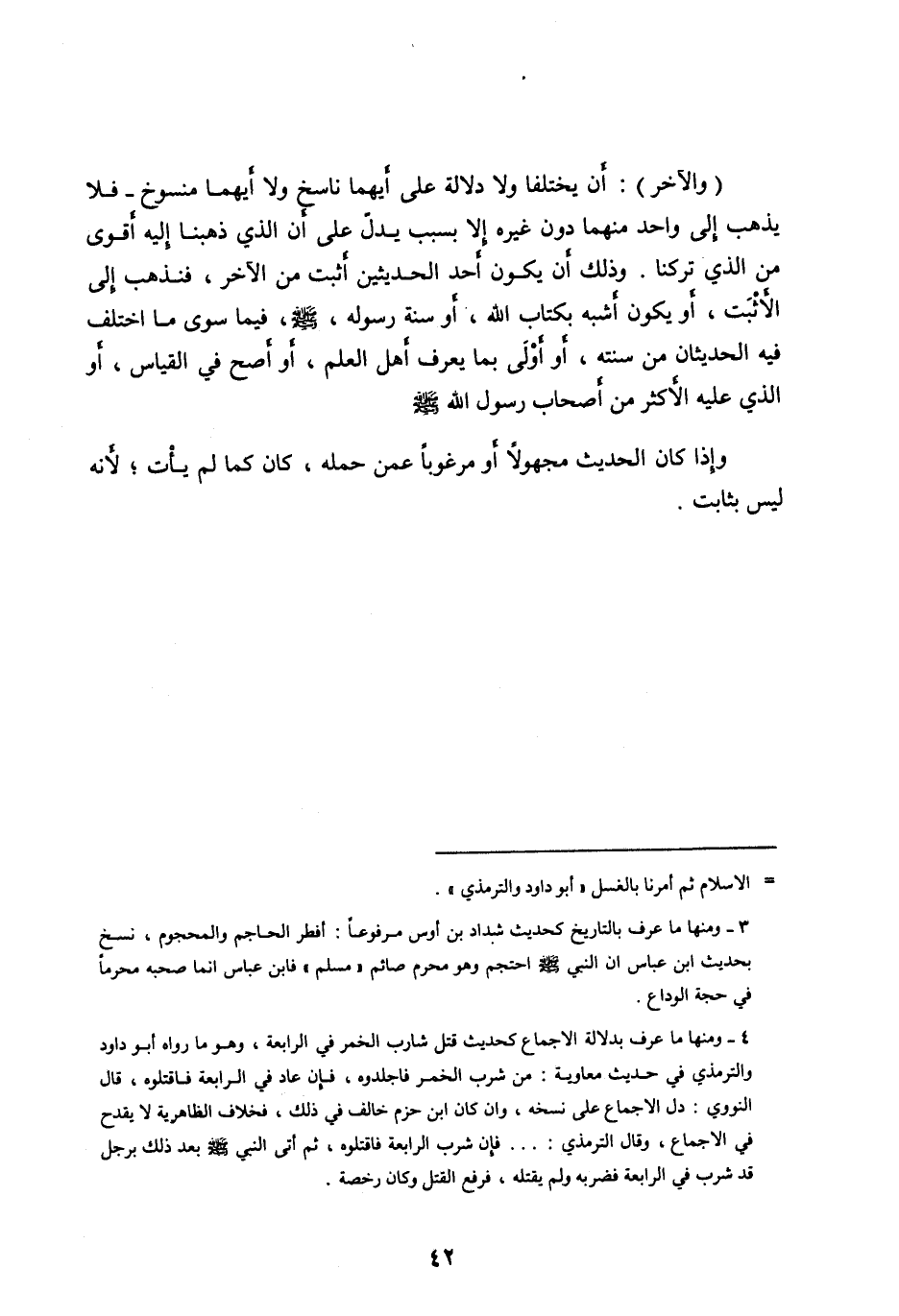 (والآخر) : أن يختلفا ولا دلالة على أيهما ناسخ ولا أيهما منسوخ- فلا يذهب إلى واحد منهما دون غيره إلا بسبب يدلّ على أن الذي ذهبنا إليه أقوى من الذي تركنا. وذلك أن يكون أحد الحديثين أثبت من الآخر، فنذهب إلى الأثبت، أو يكون أشبه بكتاب الله، أو سنة رسوله، صلى الله عليه وسلّم، فيما سوى ما اختلف فيه الحديثان من سنته، أو أولى بما يعرف أهل العلم، أو أصح في القياس، أو الذي عليه الأكثر مِنْ أَصْحَابِ رَسُولِ اللهِ صَلَّى اللهُ عَلَيْهِ وسلم وإذا كان الحديث مجهولا أو مرغوبا عمن حمله، كان كما لم يأت، لأنه ليس بثابت.