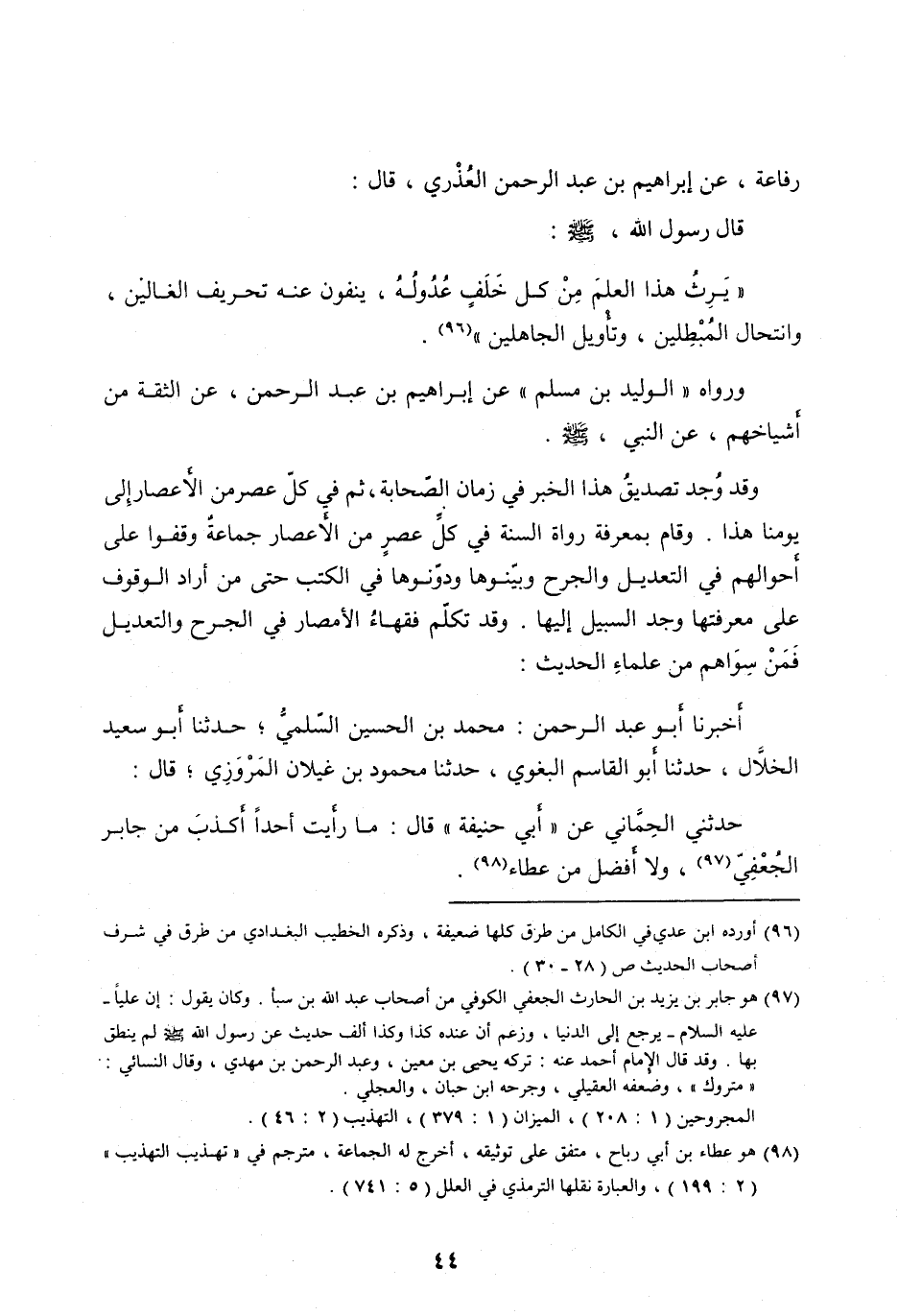 قَالَ رَسُولُ اللهِ، صَلَّى اللهُ عَلَيْهِ وسلم: «يرث هذا العلم من كل خلف عدوله، ينفون عنه تحريف الغالين، وانتحال المبطلين، وتأويل الجاهلين» [ (96) ] .