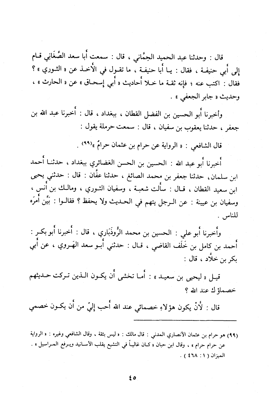 [ (99) ] هو حرام بن عثمان الأنصاري المدني: قال مالك: «ليس بثقة، وقال الشافعي وغيره: «الرواية عن حرام حرام» ، وقال ابن حبان «كان غاليا في التشيع يقلب الأسانيد ويرفع المراسيل» .